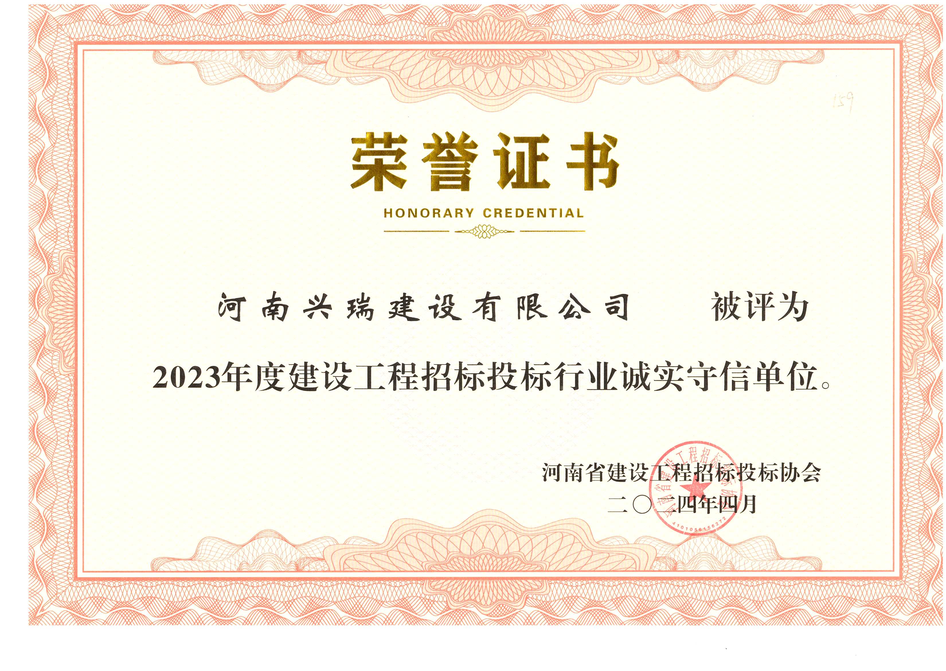 近日,河南省建设工程招标投标协会发布了《关于公布2023年度建设工程招标投标行业诚实守信单位的通知》,我公司荣获河南省招标投标协会2023年度“诚实守信单位”荣誉称号!